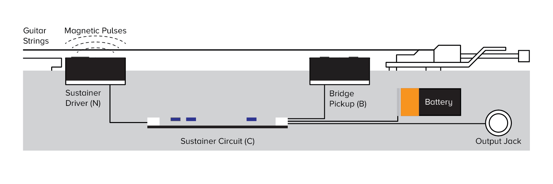 System generates a magnetic field causing the strings of the guitar to vibrate. Powered by a 9-volt battery, the interaction of the bridge pickup, the sustainer circuit board and the neck sustainer driver pickup, projects magnetic pulses that continuously vibrate the strings of the guitar, the same way an amplifier would at extreme volumes, yet totally controlled! The result is infinite sustain and/or feedback using sparkly clean or loud distorted settings without the need for excessive volume or extra outboard gear!